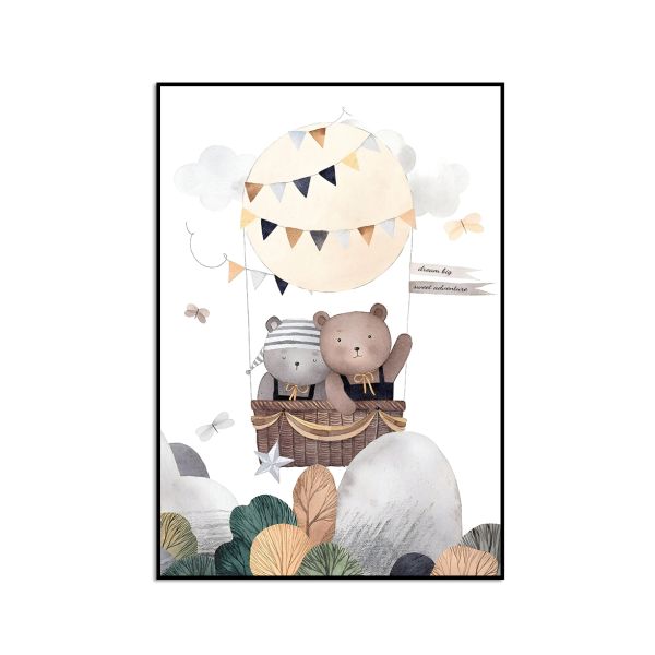 This adorable 'Bear Balloon Adventure' poster features two bears in a hot air balloon, perfect for adding charm and whimsy to any nursery or child's room.