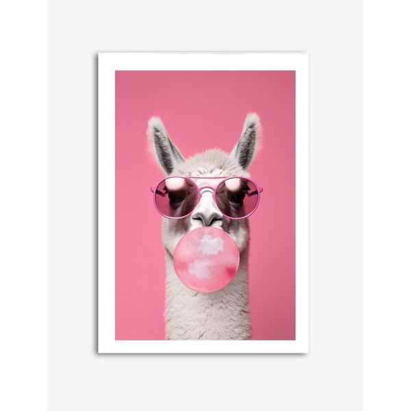 Add a quirky and playful touch to your decor with this Bubblegum Llama poster. The vibrant artwork features a llama wearing sunglasses and blowing a bubblegum, adding a pop of color and fun to any room.