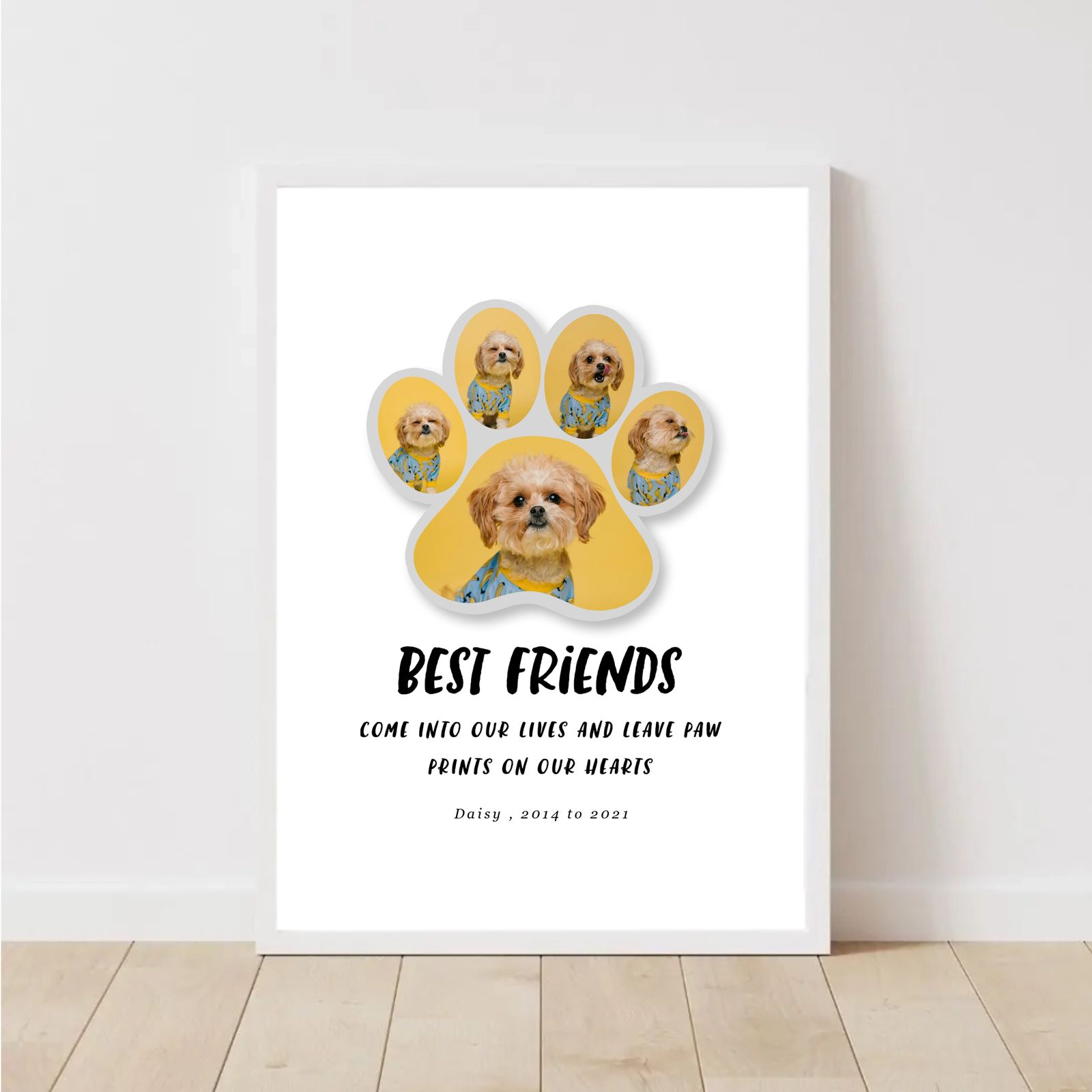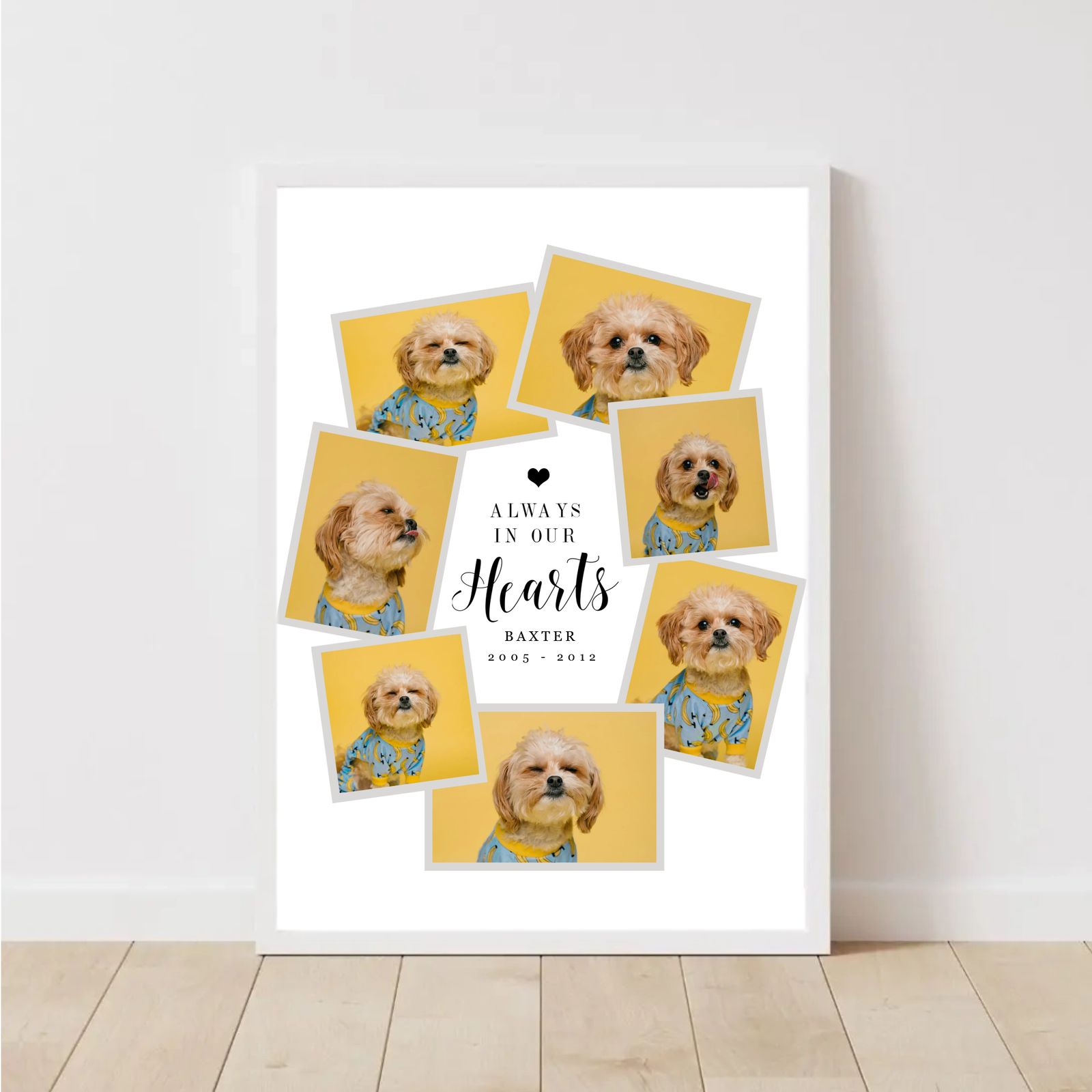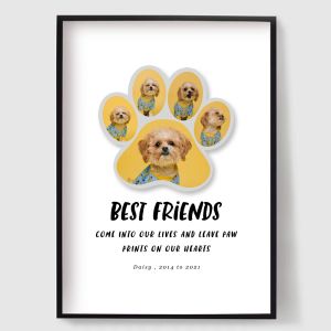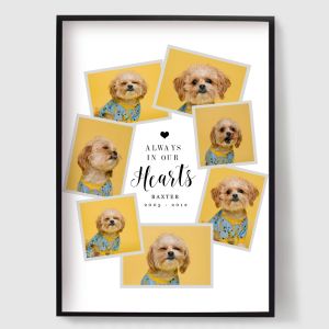 Our personalised pet memorial posters offer a unique and heartfelt way to remember your beloved pets. Each poster is customised to your specifications, ensuring a one-of-a-kind tribute that truly honours your pet's life and personality. These posters are not only a touching way to memorialise your furry friends but also a beautiful addition to any room. Celebrate and cherish their memories with our bespoke designs.
