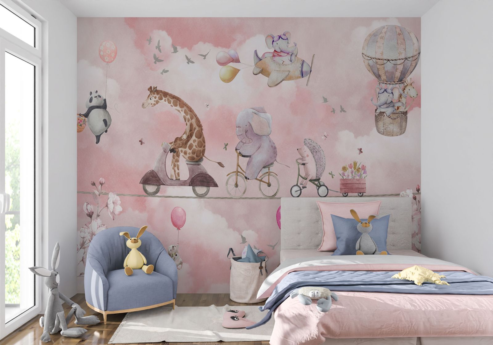 This delightful children's wall paper features a whimsical design with animals on adventures, perfect for a nursery or kid's room. The soft pink backdrop adds a charming and playful touch, creating a warm and inviting atmosphere. The animal characters include a cycling hedgehog, a giraffe on a scooter, and a panda holding balloons, sparking imagination. Ideal for transforming any space into a joyful haven. Product contains a single wall paper only.
