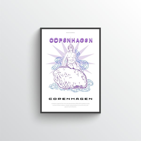 Located at Langelinie Pier, the Little Mermaid statue (1913), which is based on a story by Hans Christian Andersen. A Danish national symbol, it is one of the city's most popular tourist attractions. Text in poster: Copenhagen. Product contains a single poster only.