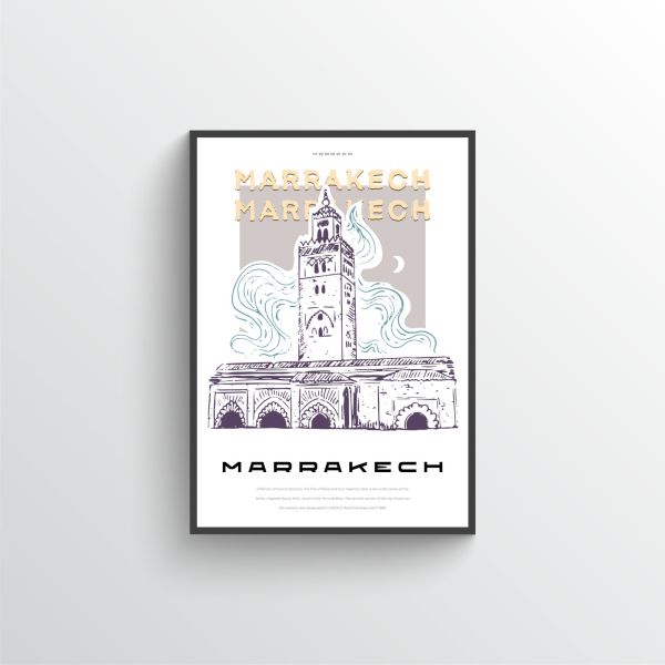 Discover the serene charm of Marrakech with this elegantly designed poster. Featuring a beautiful illustration of a notable landmark in Marrakech, the Koutoubia Mosque, set against a delicate sky background. The text 'MARRAKECH' is prominently displayed. Perfect for enhancing any living space with a touch of Moroccan culture. Product contains a single poster only.