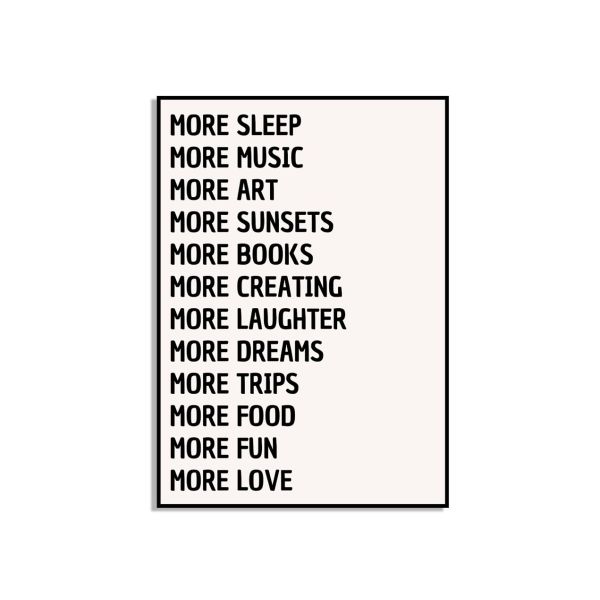 This poster features an inspiring list of positive statements focused on enhancing various aspects of life. It includes phrases like 'MORE SLEEP,' 'MORE MUSIC,' 'MORE ART,' and more, aiming to uplift and motivate. A perfect addition to any room to remind you of the little things that bring happiness. Product contains a single poster only.