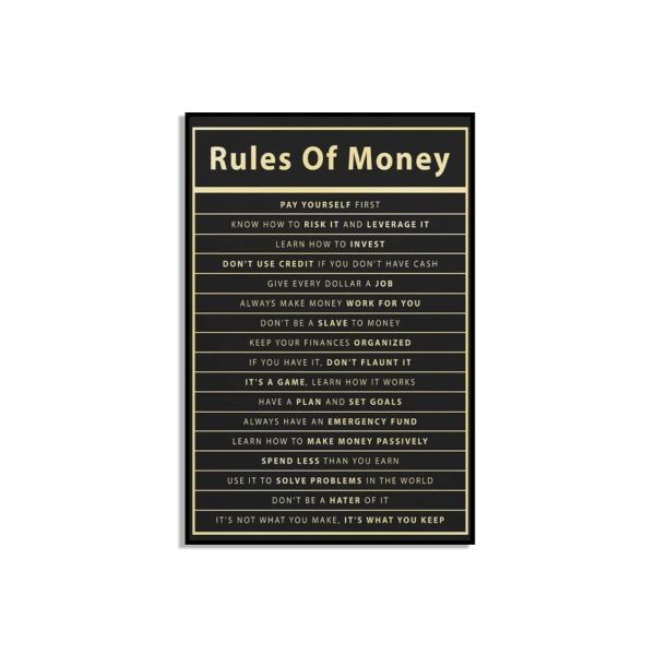 This poster features a comprehensive list of important financial principles. The text, 'Rules Of Money,' along with guidelines such as 'Pay Yourself First' and 'Keep Your Finances Organized,' make this poster a motivational and educational piece for any space. Product contains a single poster only.