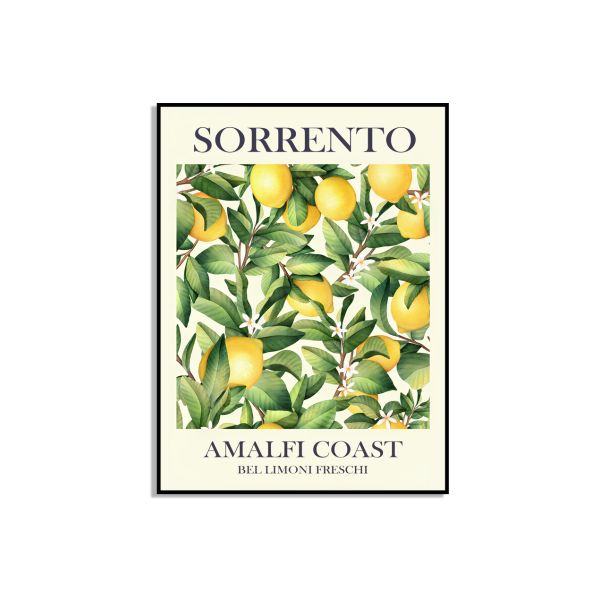 Experience the vibrant charm of Italy's Amalfi Coast with this Sorrento poster featuring fresh lemons and lush foliage. Ideal for bringing a touch of Mediterranean elegance to any room.